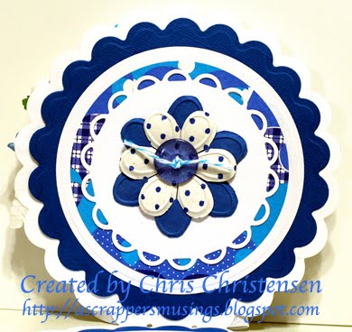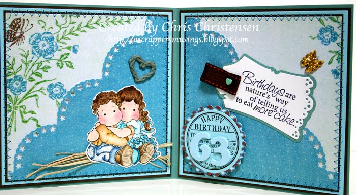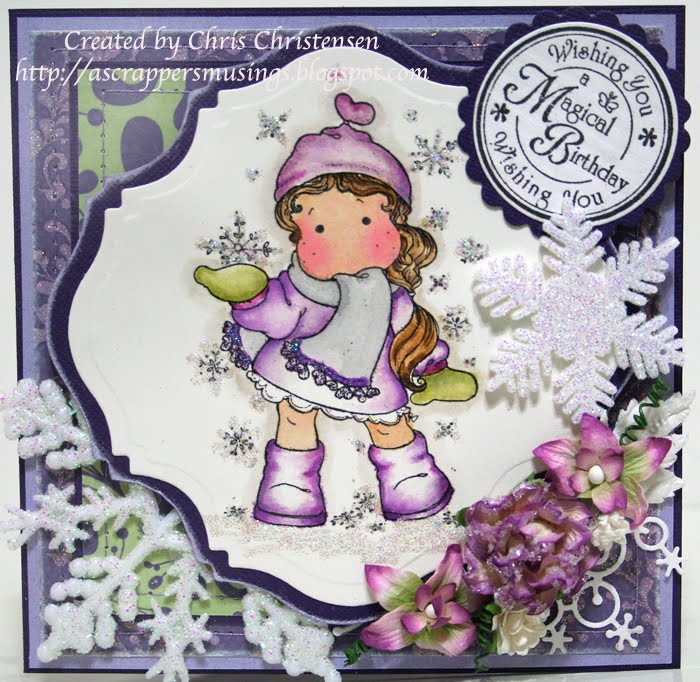 This panel was so much fun! I love that precious little stamp! Karen doesn't currently have them in her store, but keep checking back. I used Copic pens to color the image. I accented the image by adding Kindyglitz in yellow, orange, light green, dark green. I used a cyan piece of glittered cardstock for the background and cut it with one of my dies. The stamp is from my stash. I chose to use my Nesties dies and cut a scalloped background in a royal blue glittered cardstock.