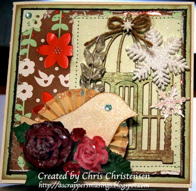 I used kraft colored cardstock for the bird cage and then applied Perfect Pearls in Verdigris to the cardstock. It made it look a shiny shade of aged copper. Love the effect. The rhinestones were clear, but were colored with Copic Markers. The paper is so pretty. You cannot tell from the photos, but the red flowers are foil. That added even more shine! Keeping the rustic look was important so I added twine to the top of the birdcage. The accordion flower is trimmed in glitter as are the roses. The snowflakes are covered in sparkles. I heat embossed the middle-sized one to get the sparkles on the punched cut.The largest snowflake came covered in sparkles. The bird was cut from cream colored glitter cardstock. I used ink along the edge of the bird and some of the paper mats. There are also distressed edges and machine stitching. Here is the inside: