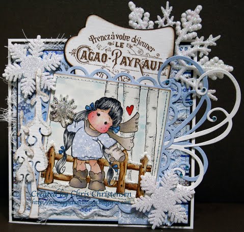 Also used on the front panel is a very pretty grey vellum that has snowflakes printed on it. You can't see it well as I managed to cover it up! Sheesh! I used snowflakes from my stash. One is wood veneer while the other three are crystalline and white. Tilda is sitting on a layer of snow created by using Kindyglitz. Tilda was colored with Distress Inks. The flower is grey felt. I added a brown photo turn to hold the tag in place. The tag has also been outlined in Kindyglitz.