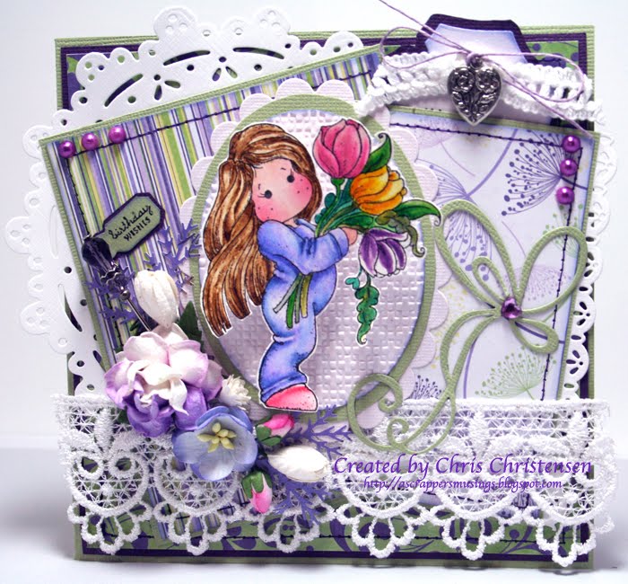 Well, I decided to give entering a challenge another try. This challenge is at Creashop Duymelot in the Netherlands. The challenge was to create a card featuring Drip Drop Tilda. I've had this little gem of a stamp since the end of January and have just now had the time to ink her up and create a card. I just love it! It is the cutest little stamp! Please click on photos to see a larger image.Here is my card: